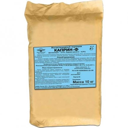 Препарат «Каприн Ф» выпускается в виде дуста, содержащего в качестве действующих веществ пиретроид фенвалерат (0,4%), масло индустриальное (1%), кремнефтористый натрий (5%), скипидар (1%) и наполнители – каолин (10%), талькомагнезит или белая сажа – до 100%. Выпускается в готовом к применению виде: в упаковках из двойного полиэтилена по 100-200 г или объемом 60, 100 и 200 см3 – для быта и 10-15-20 кг – для дезорганизации. Дуст «Каприн Ф» обладает острой инсектицидной активностью по отношению к синантропным тараканам, постельным клопам и блохам, и остаточным действием от 1 до 2-х месяцев. Препарат предназначен для борьбы с синантропными тараканами, постельными клопами и блохами.